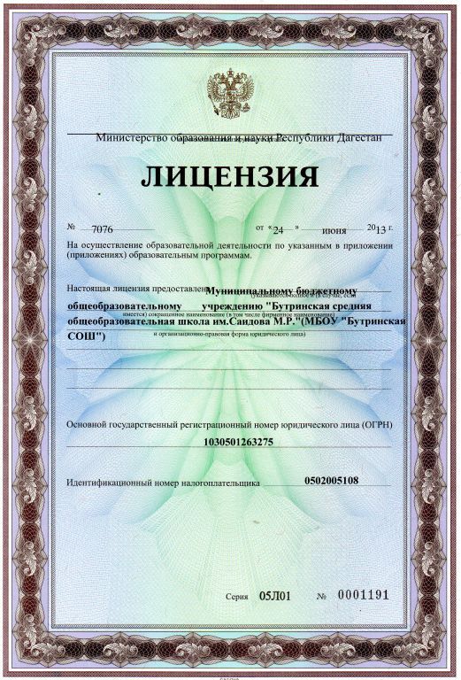 | Полное наименование образовательной организации* | Муниципальное казенное общеобразовательное учреждение "Бутринская средняя общеобразовательная школа им.Саидова М.Р." |